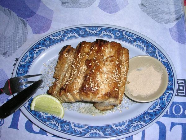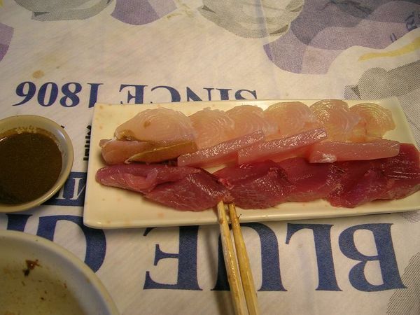 恢復精神後,第一件事當然是帶著大黑去找食物吃,準備環島行程,這次學聰明了放了一半的行李在民宿,這樣騎起來又輕鬆許多。在來的路上早就相中了一家叫徐家燒肉,一碗$30的招牌深深吸我,經老板介紹得知剛向漁家買了新鮮的魚,二話不說點了一碗焢肉飯和一道綜合生魚片,由上而下依序是鰆魚、黑皮旗魚、大目鮪魚,都是當季剛補到的,新鮮沒話說,而且在台灣沒聽過也沒吃過。
