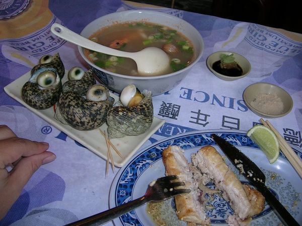 繞了一圈回到徐燒肉。恭喜大黑完成了第二個環島-綠島,特別點了一份老板推薦的香煎黑皮旗魚、瑩光螺、綜合海鮮湯來慶祝。其中瑩光螺的蓋子像一個石頭一樣大,決定帶兩顆回去給溫某聞香一下,而且螺肉上頭還有螺旋的紋路是當地的特產,好神奇。