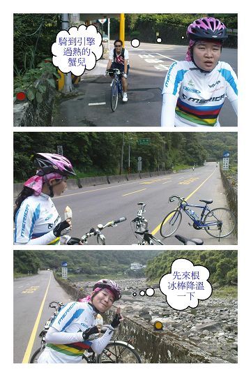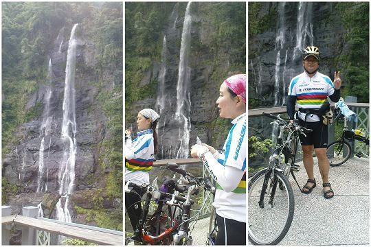 雖說是肉腳團,但大家還是以很快的速度就到了瀑布拍照留念,恭喜大家騎單車挑戰烏來成功。稍微休息一下,接著就打算加碼往內洞森林遊樂區的方向前進,享受一下號稱全台芬多精含量最多的森林遊樂區,幫大家補一下芬多精。(圖說:中間是本團最強的女車手小莉和蟹兒。)