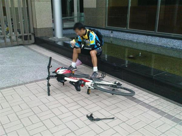 今天又拔得頭香第一個到中庭等大家。過不久凱哥社長也沖沖的下來去買早餐吃,不過一早還沒出門,凱哥似乎就開始塞運連連,才到社區門口就慘叫了一聲,原來社長的愛駒駐車架和車身分屍了,那哀嚎聲當場笑翻我和宮主。