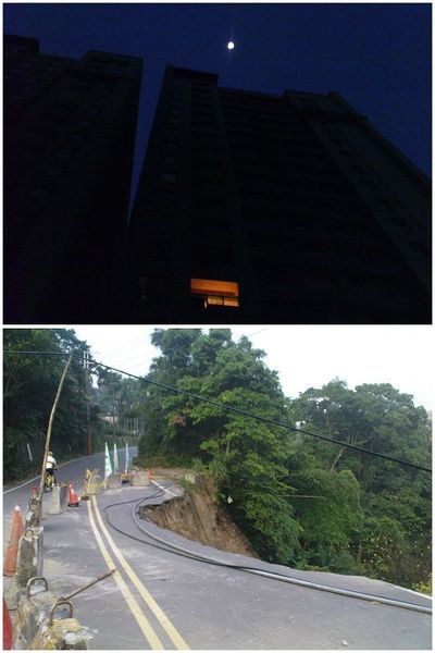 又是一個天還沒亮就出發的早晨,第一張照片發現月亮正在社區上面的天空。由於班長前一天太累爬不起來,所以我和林大哥先偷跑,反正班長和右護髮速度快,一定會追到我們的。到了靈隱寺上面一點後,發現辛樂克帶來的創傷果然還沒恢復,路攤了一大塊...,左前方是林大哥,看看比例就清楚了;而此時班長和右護髮也已追到竹崙前的7-11吃早餐,動作果真迅速。