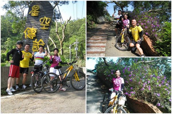 ?話說出發前足爽教練說上面幾百公尺的地方還有另一間餐廳--星空傳說,說我們可以騎上去看一下,在稍作休息後,又繼續往上爬,就在此接到其他社員鄰居來的電話,說是也到了白雞。在星空傳說才發現班長的車衣和旁邊花是一樣的色系和圖案,真是漂亮。目前還是單身的班長,有興趣想要認識她的朋友動作要快,因為右護髮要在mobile01上幫班長徵友,但是班長說這裡的花有點枯委了,要每天上來澆花,請大家有心裡準備...。
