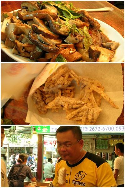 在往白雞行脩宮的路上雖然不陡,但是我也騎的哀哀叫,而且太陽公公也出來向我們加油,真是後悔答應大家在白雞會合。不過說著也很神奇,就如同足爽說的一樣,會感覺很輕鬆的一下就到了。因為上次騎的時候覺得好遠,就在我覺得應該還有一段距離的時候就到了,總算看到大家了。我吃了幾口滷味就受不了的跑去買冰淇淋和冰涼的冬瓜茶降溫,真是一整個腿軟,此時張大哥還幫我們攻紫薇的四人加菜,買了好多炸芋頭和蕃薯,真是太感謝了。
