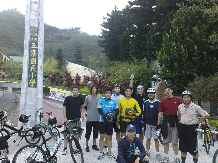 最後在副社長晶晶的送行下五點半出發,走台三線經白雞山腳下往第一集合點湊合橋出發,不過並沒有看到其他人,最後攻至五寮國小才看到人。一口氣從社區不落地的到這裡,我已經汗流夾背勉強的跟上了,主委團的實力絕非浪得虛名果然不容小覷,速度之快只有左右護髮可以輕鬆的跟上,借口幫大家拍張會師照,可以多喘兩口氣多休息個幾秒