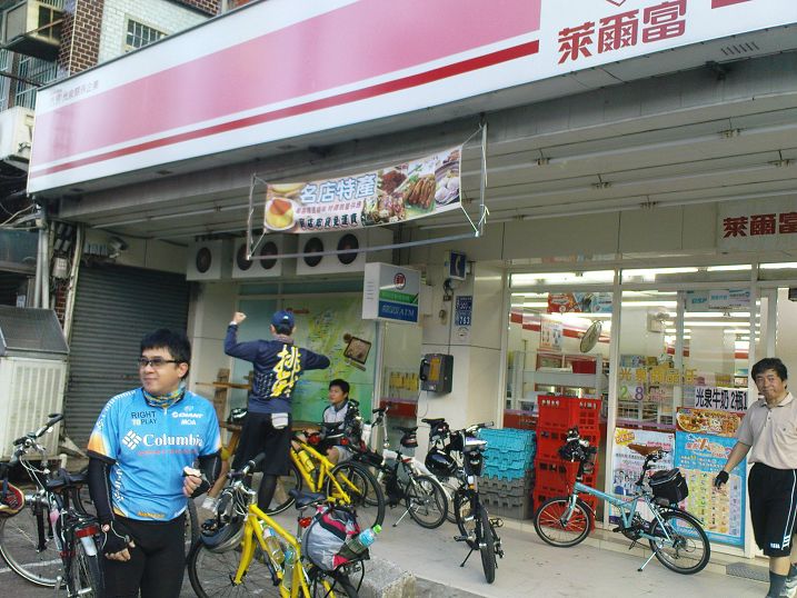 。幸好在廖大哥的陪同和加油聲中慢慢龜上去,只落地休息一次才到萊爾富,大家似乎都休息很久的樣子,臉不紅氣不喘的,跟本不像是只有騎過河濱和剛騎車的人。大家看著左護髮拿出神奇法器-坐墊打氣桶表演神功後,休息了一會兒買了一根熱狗備著就繼續上路了。而左護髮也只陪騎到此,他得回家侍侯女王。團長說下個休息點是復興,雖然我不知道有多遠,但有了前面這段路的經驗,想來是不近,於是決定照自己的速度前進,大不了自己獨自完成這趟行程囉。