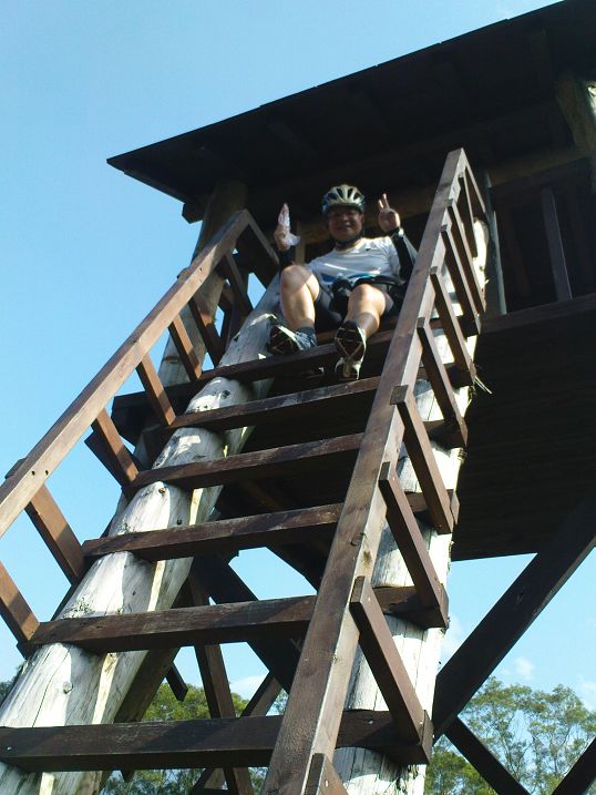上了羅馬公路後,奉團長指示要休息的就休息,最後在某個咖啡廳集合,但...沿路有很多咖啡店耶。到了樂信瓦旦紀念公園時,看到旁邊有一個很高的瞭望台,似乎只有我和右護髮有興趣,於是眼睜睜看著其他人繼續往上爬,而我和右護髮則爬上這高台看風景兼照像。我手上拿的是剛才在三民買的熱狗。