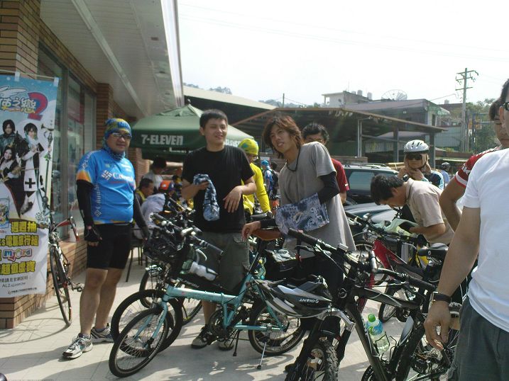 在7-11補給休息了一會兒後,竟然看到了朱大哥(就是右邊剩一半穿白色上衣的..),果然是高手中的高手,我們五點半出發,他們九點才出發,竟然和我們差不多時間到,真懷疑他們是不是騎機車丫?