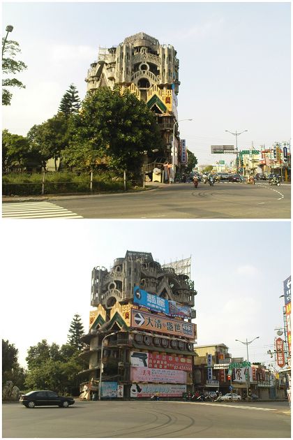 傳說中的怪屋。有人說他鬧鬼,有人說他蓋一半沒經費,而朱大哥說他是為了徵收才蓋的地上物,所以隨便蓋。看看樓梯就蓋在牆邊,還真是奇特。