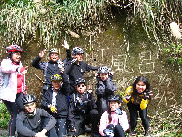 一路上首先在橫溪買早餐的地方撿到班長的同學-小白,也是一個騎小折的高手。過了竹崙橋後我就開始慢慢墊底了,邊騎邊咳嗽真是難過,到了老地方吃早餐休息時根本吃不下。不過竟然在這裡遇到另一枚高手-右護髮,他跟著主委團逆騎回來,說是待會兒有事趕時間,一路上不休息的海放主委團的高手們,並且完成維護"風呂"兩字後,又下滑來這裡和大家相遇,而這邊離熊空平台大約還有一半的路程吧。