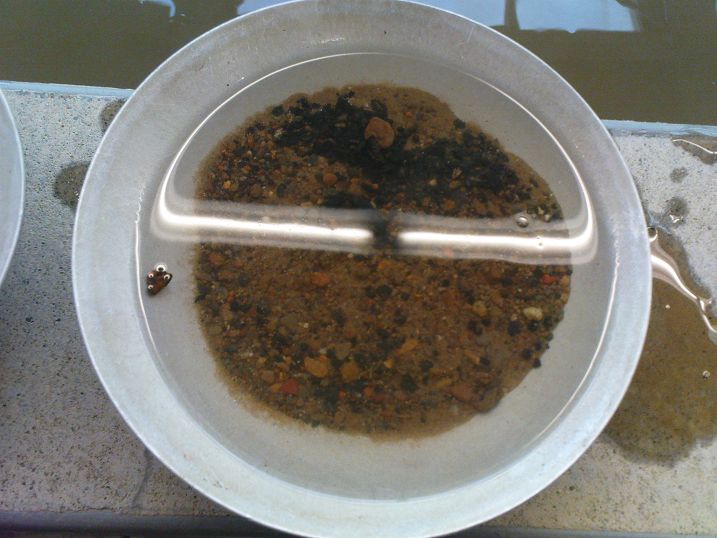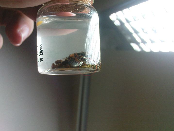 經過搖晃後,金砂較重會沈在下面,有沒有看到紅色圈圈中金光閃閃丫,那就是金砂,我第一次淘金成功。只是當年的人們可不見得有這麼好的運氣,在短短半小時內就有"這麼高"含量的金砂產出。