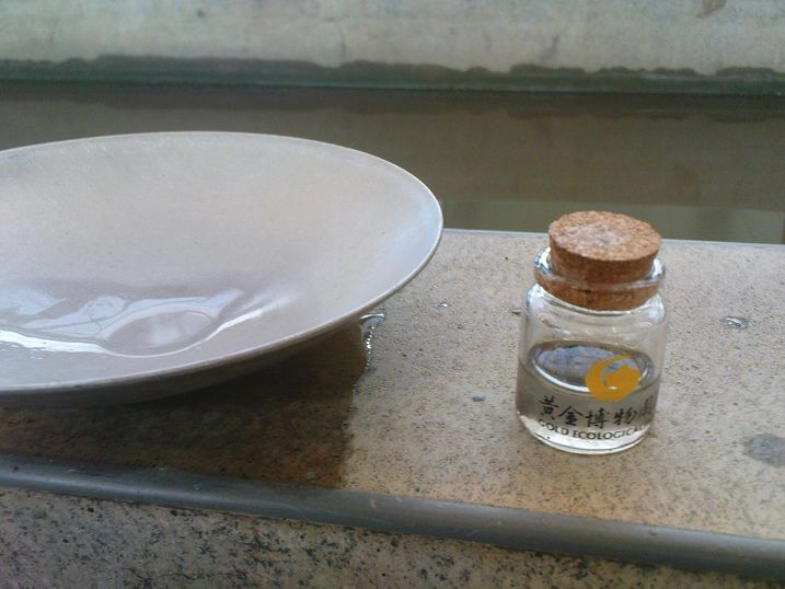 接下來利用比重的原理,把較輕的砂石讓水流帶走,剩下約50元硬幣大小的量,然後倒進小瓶子。