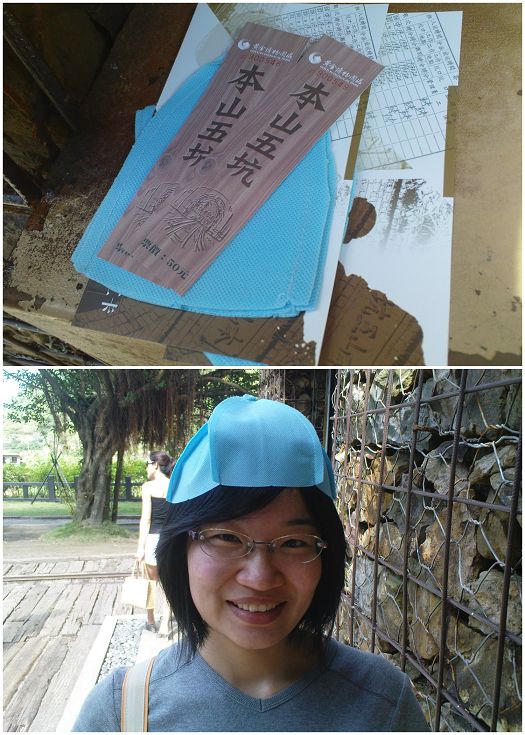 進去參觀前要先購票$50/人,而且館方還會發給每人一個內襯,原來是要戴上礦工用的安全帽才能進入礦坑內參觀,看看可愛的麻豆示範安全帽怎麼戴吧。