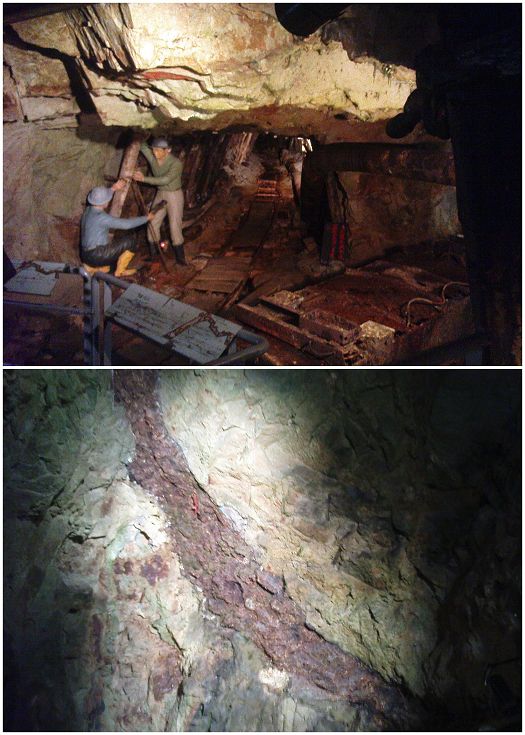 裡頭展示了工人們在坑道工作的情況,下面那條顏色不一樣,從左上斜到右下的就是黃金礦脈。