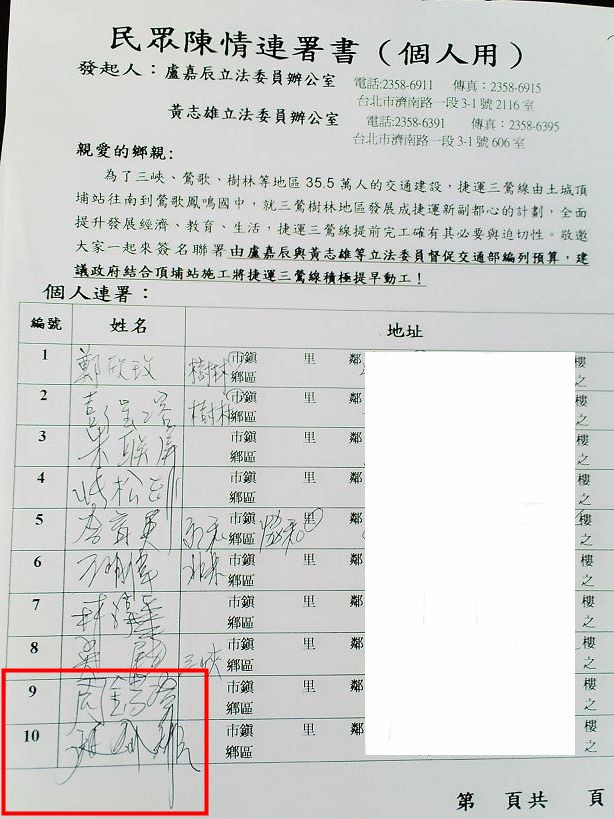 這是去年(2009.6.13)台北縣周錫瑋縣長和遠雄趙藤雄董事,來北大特區參加活動時所簽的名字,請所有支持的朋友都來幫忙連署吧,尤其是盧嘉辰和黃志雄兩位立委。